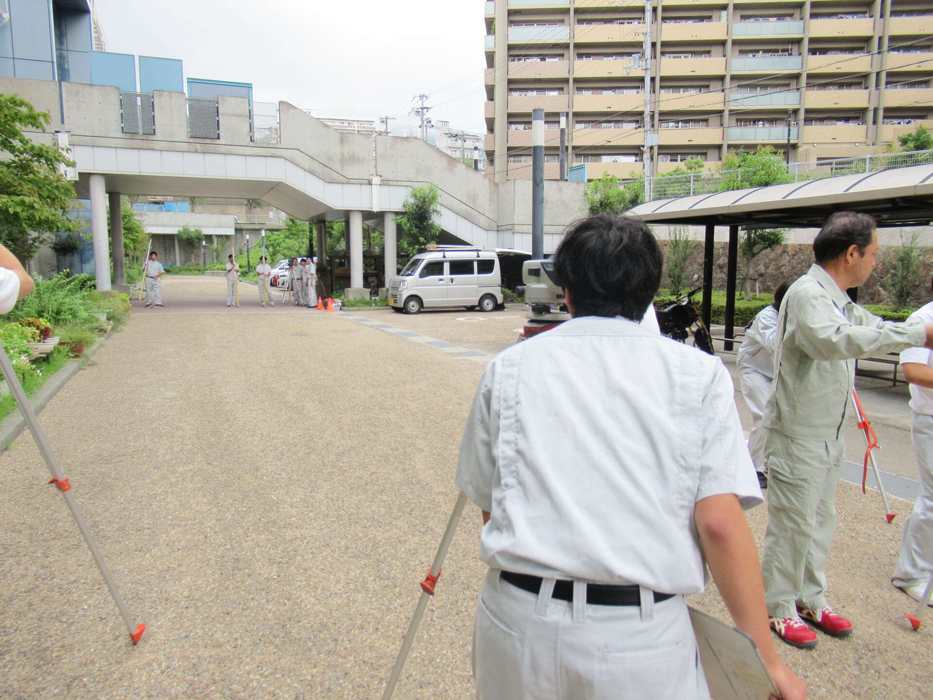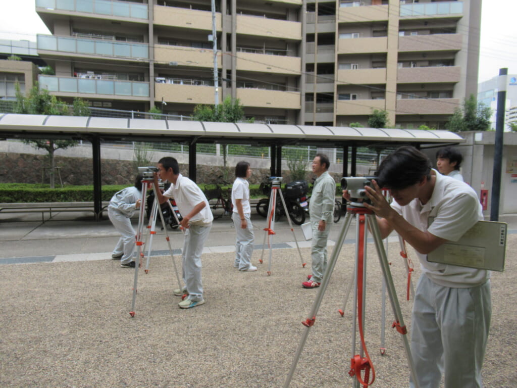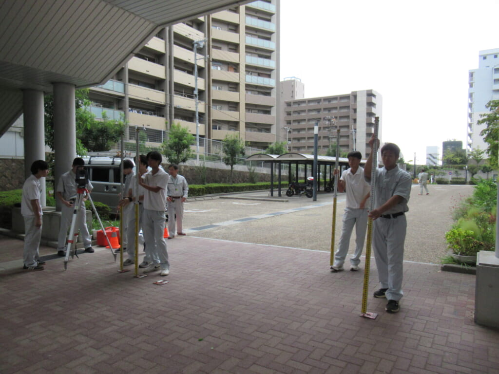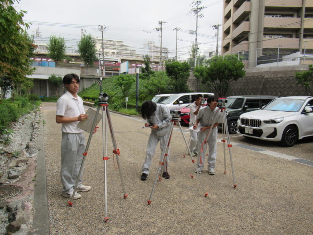 都市工学科では、1年次から実践的な学びを重視し、「工業技術基礎」の実習科目に取り組みます。2年次には「都市実習」を通じて、より専門的な知識と技術の習得を目指します。この「都市実習」では、測量、設計演習、鉄筋の組立てなど、まちづくりに欠かせない技術の習得を目指します。特に測量では、段階的に「共通測量」と「専門測量」の2種類の技術を習得。共通測量では、オートレベルという測量機材を使用し、校舎周辺の高低差を測定します。実習は二人一組で行い、声を掛け合いながら協力して作業を進めることで、技術だけでなくコミュニケーション力やチームワークも養います。こうした実践的な学びを通じて、都市工学科の学生は、未来の都市を支える確かな力を身につけていきます。