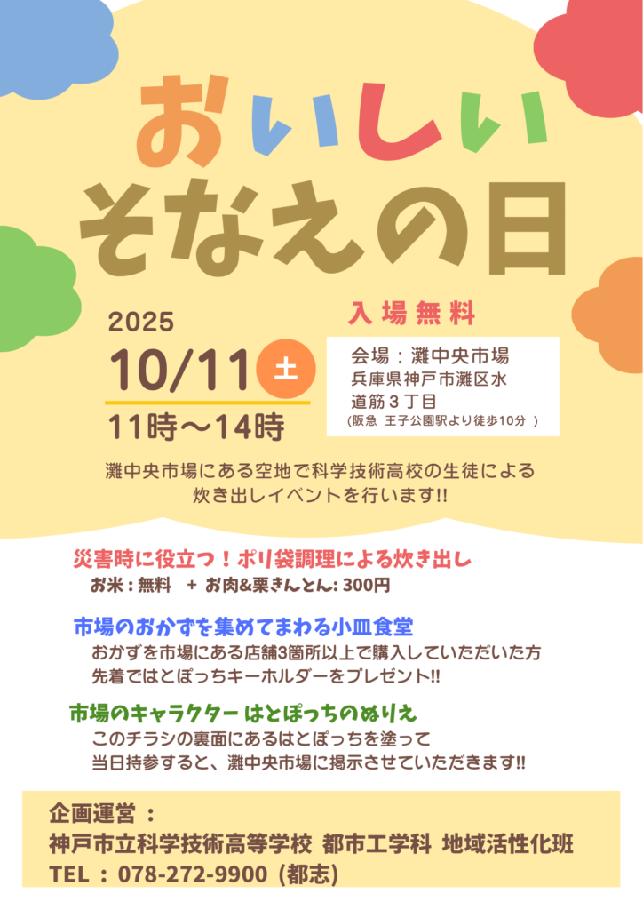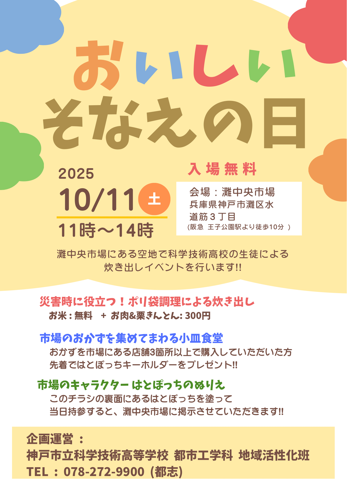 10月11日(土)、灘区水道筋にある灘中央市場にて、炊き出しイベントを開催します。 この取り組みは、灘中央市場の活気を取り戻すことを目的に、地域と本校が連携して3年前から続けている活動の一環です。都市工学科では、まちづくりができる人材育成を目指しており、生徒たちは地域に寄り添いながらまちが元気になるきっかけを探求しています。当日は、地域の皆さまをはじめ、さまざまな方々に市場の「食の豊かさ」を体感していただけるよう、あたたかいごはんとおかずをご用意しています。 本校の生徒たちは、屋台の制作やポリ袋調理の技術習得など、炊き出しに向けて準備を重ねてきました。ぜひ灘中央市場にお越しいただき、心も体も温まるひとときをお過ごしください。 皆さまのご来場を心よりお待ちしております!