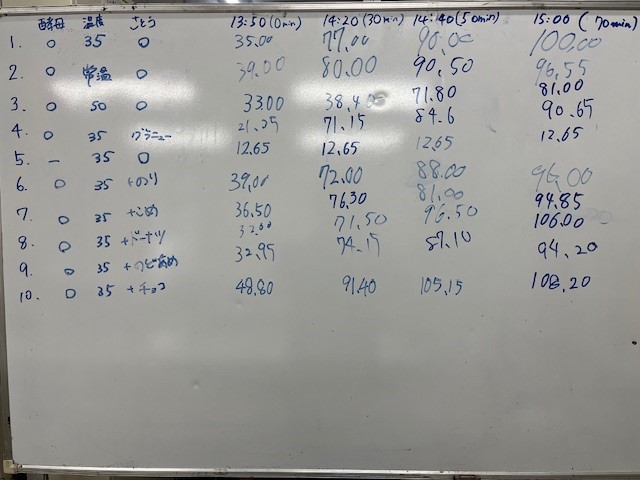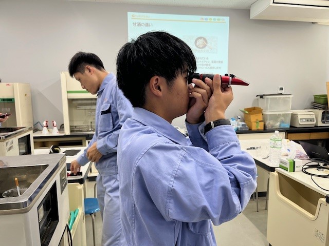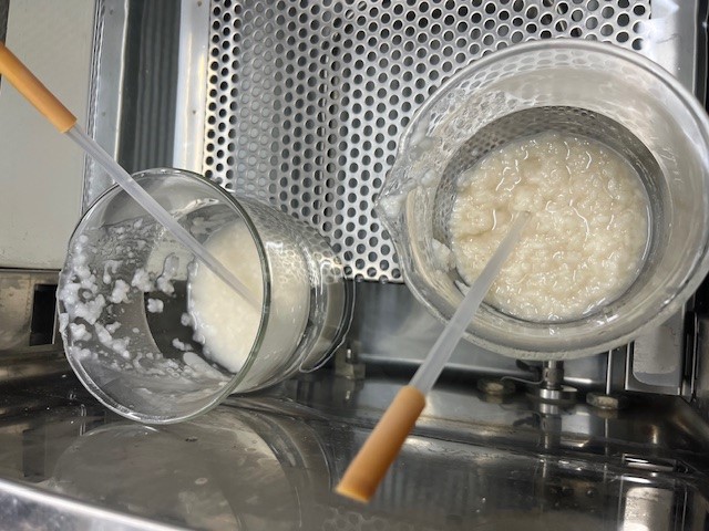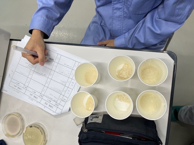 初日は「こうじ甘酒試作」というテーマで実験を行いました。授業で聞いたことはあるけど難しかった内容である、デンプンを糖に変えるというこうじ菌の働きについて、図を用いて教えていただき理解することができました。また、同じこうじ菌でも黄麹菌や白麹菌などその種類によって、作られる甘酒の成分が大きく異なることを知りました。試飲の際、味覚でその違いを感じたときはとても驚きました。