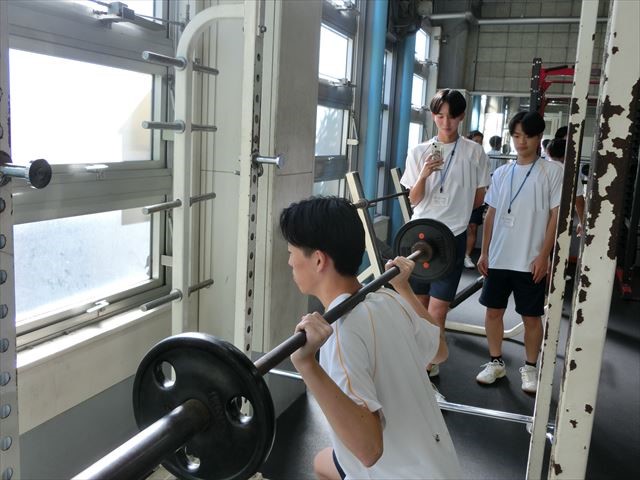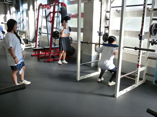 場所をトレーニングセンターへと移し、3人一組でハイパースクワットとローバースクワットの横からのフォームをスマートフォンで撮影しました。特にローバースクワットは慣れていない者が多く、バーを担ぐ位置に手間取りました。2つのフォームをそれぞれ撮影した後、再び講義室へ戻りました。撮影動画を確認後、しゃがんだ時点の位置(頭、バー、腰、ひざ、かかと、つま先)を図に示しました。特徴として分かったのは、ハイバースクワットは比較的腰には安全である。ローバースクワットは前後の動きがハイバースクワットに比べて大きい為、腰に負担が掛かることが分かりました。最後に考察の発表も行いました。「背の高さによってフォームは分れる」、「つま先は出さなければいけない」、「競技種目によって重さは必要ない」、「効果を上げるためにはスピードも必要」などの意見が出ました。