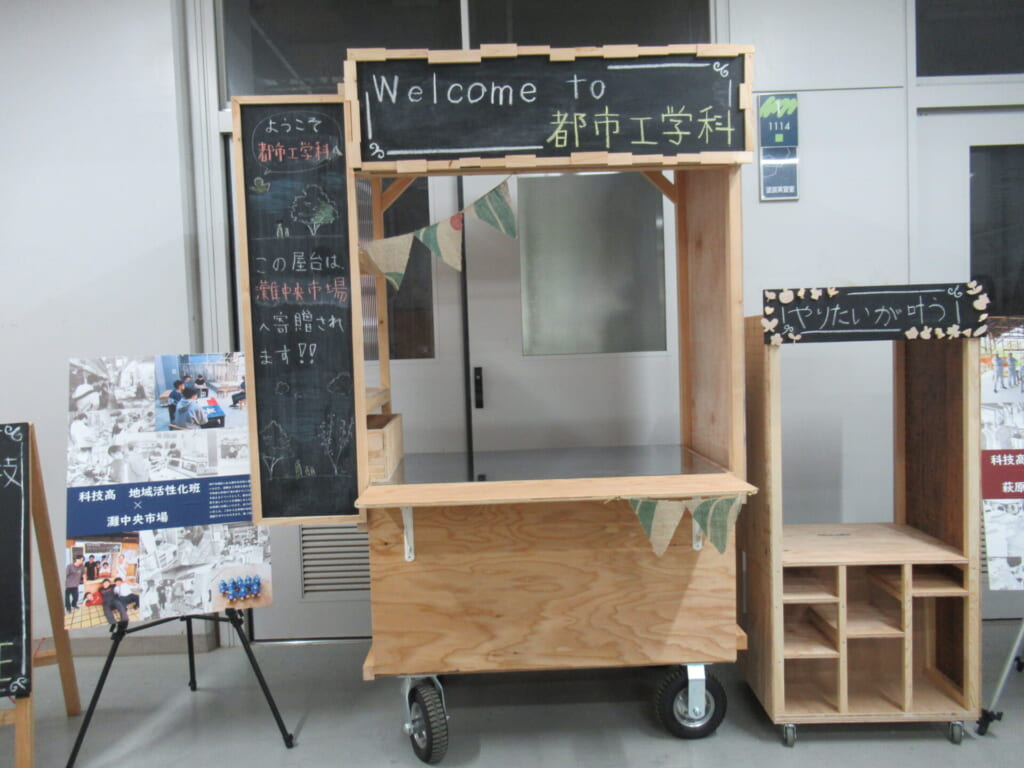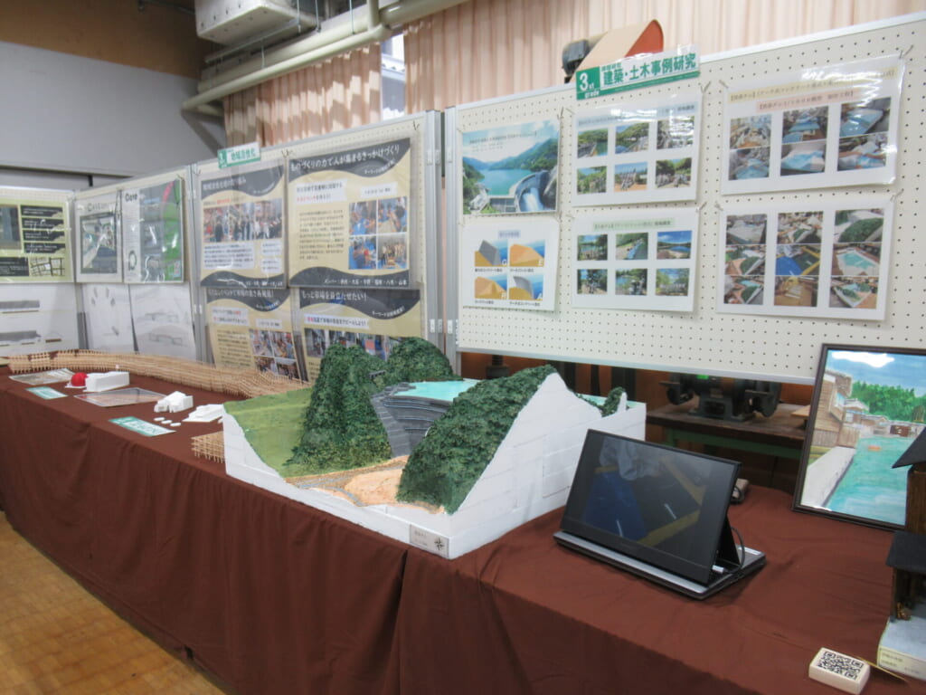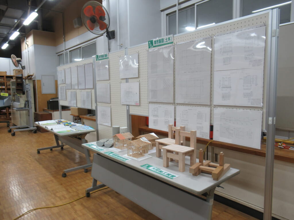 都市工学科では、3年間の学びの様子を紹介する展示を行い、在校生が来場者の皆さんに向けて学科の説明や作品の紹介を行いました。実際の授業で取り組んだ成果物を通して、都市工学科での学びの魅力を感じていただけたのではないかと思います。