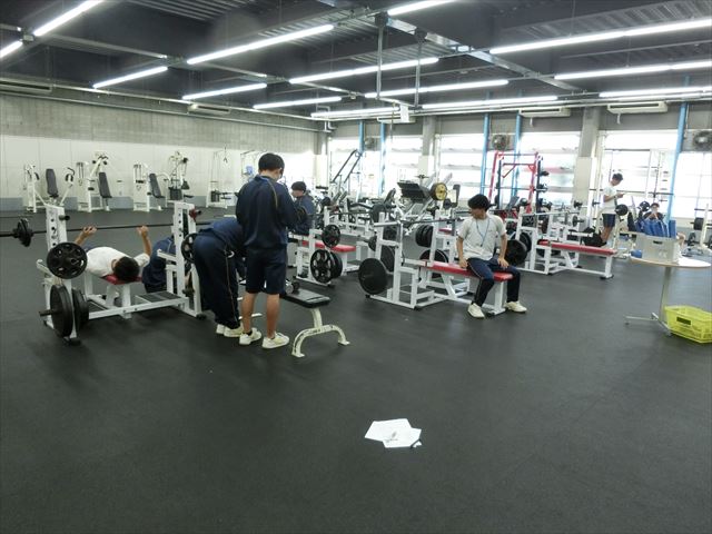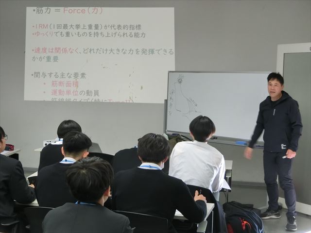 前半の講義では「筋力とパワーの違い」、「ウェイトトレーニングにおける1RM(反復最大挙上重量)決定からのトレーニング目標」、「力の立ち上がり速度」について学びました。筋力とは速度は関係なく、“どれだけ大きな力を発揮できるか”が重要である。一方、パワーとは力だけでなく、“どれだけ速く力を発揮できるか”が重要である。ウェイトトレーニングの反復回数と挙上重量は反比例の関係にあり、重量が重たくなるほど、反復回数は少なくなる。力の立ち上がり速度とは、最小限の時間で最大の力を生みだす事で、爆発的な筋力を指標とする事を理解しました。前回同様、曽我部先生からは優しい口調ながら多くの質問が私たちに向けられました。いつでも回答の順番が回ってくる可能性がある為、緊張感を持ちながら、頭をフル回転して言語化に努めました。