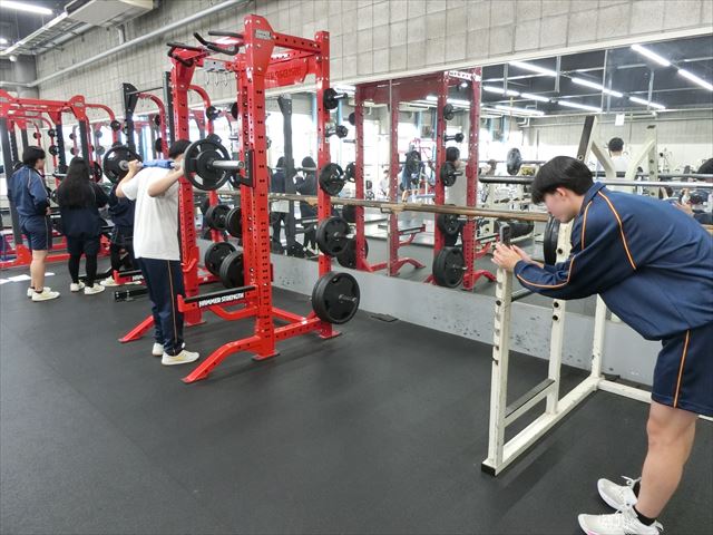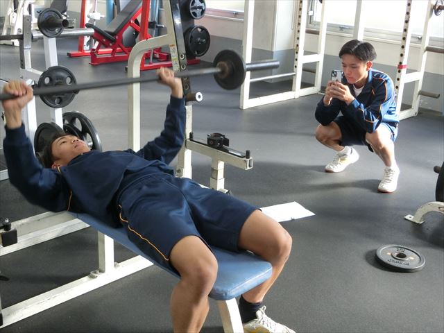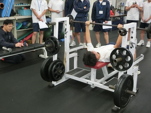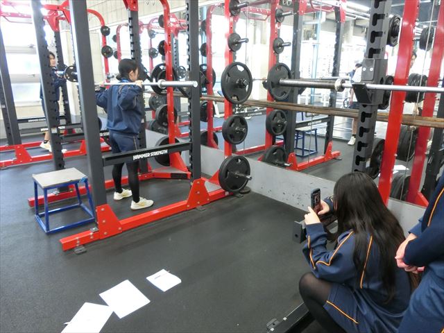 後半の実技では、場所をトレーニングルームに移しました。3人一組となり、ベンチプレスもしくはスクワットの種目を選択し、ウェイトを挙げる速度を指標として使用するトレーニング「ヴェロシティ・ベースド・トレーニング(VBT)」の専用アプリを用いて、力と速度の関係を調べました。