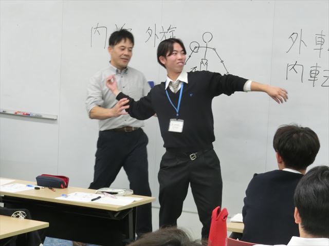 前半の講義では「動きの説明」について学びました。配布されたプリントを見て、記された動きを言葉で直接、曽我部先生に伝えました。しかし、動きを言葉で伝えるのは大変難しく、折角モデルになってくれた先生をおかしな格好にさせてしまいました。その理由は伝える言葉のチョイスでした。「腕を曲げる」ではなく「肘関節を屈曲する」、「腕を上げる」ではなく「肩関節を外転する」等、関節を動かす表現で正しく伝える事を理解しました。