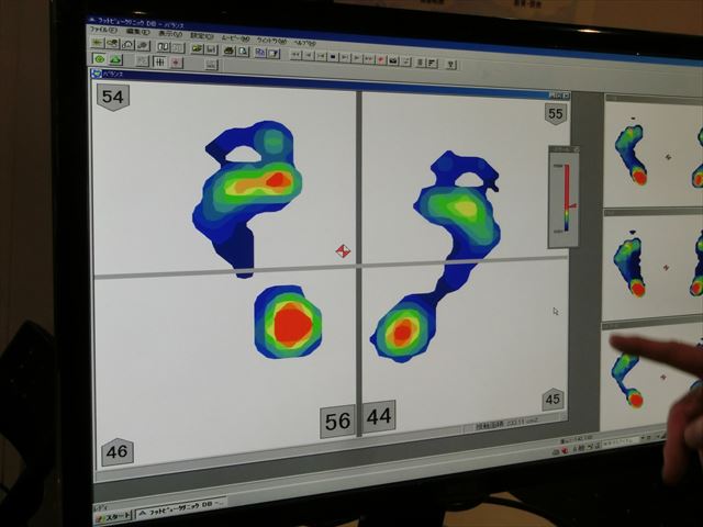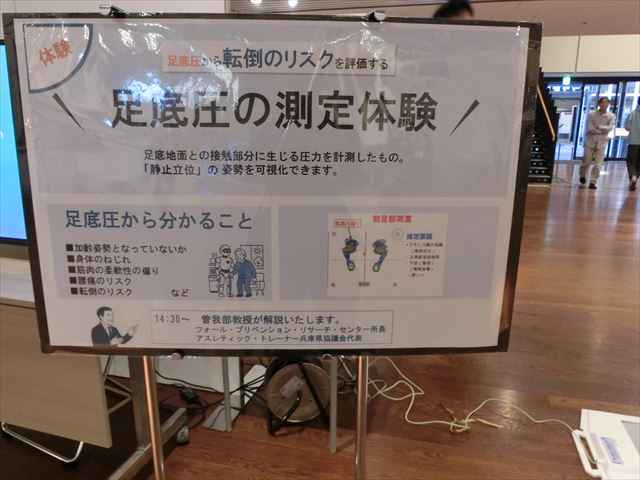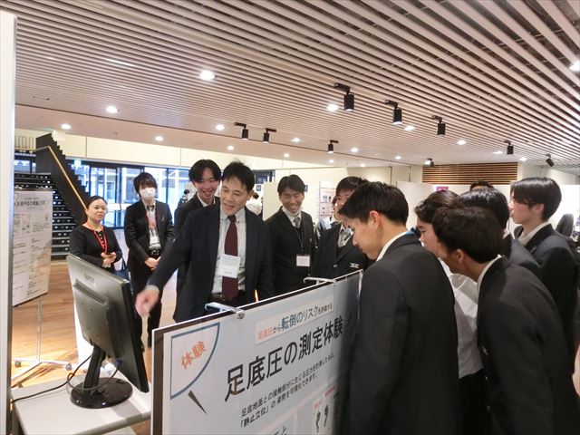 最後に場所をiCommonsに移し、自然科学研究科の大学院生のポスター展示コーナーに参加しました。私たちは1月の課題研究発表会に向けて、学校では発表ポスター作成中です。時期的にも大変タイムリーであり、刺激を受けると同時に、ポスター作りの参考にもなりました。そのまま曽我部先生の「足底圧測定体験」のブースへ移りました。各自が足底圧センサーに乗って測りました。モニターを見ながら、最も圧力が高い箇所、重心の位置を確認し、先生からは、両足外側荷重の人であれば、推定要因として内反足やハイアーチである解説を受け、自らの足の特徴を理解しました。
