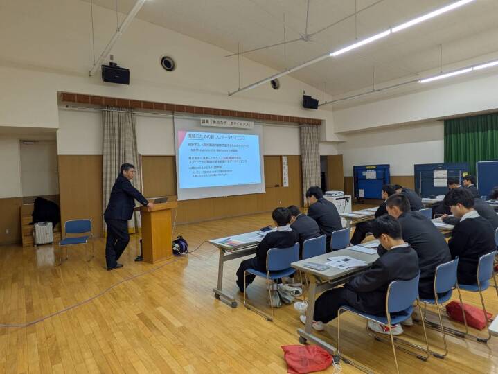 講義では、データをどのように調べ、どのような視点で捉えるべきかといった基本的な考え方から、確率的なものの見方、確率や期待値に伴うリスクとメリットの捉え方まで、幅広くお話しいただきました。これらの内容は、今後2・3年生で取り組む実習や課題研究において大いに役立つものであり、生徒たちにとって貴重な学びの機会となりました。