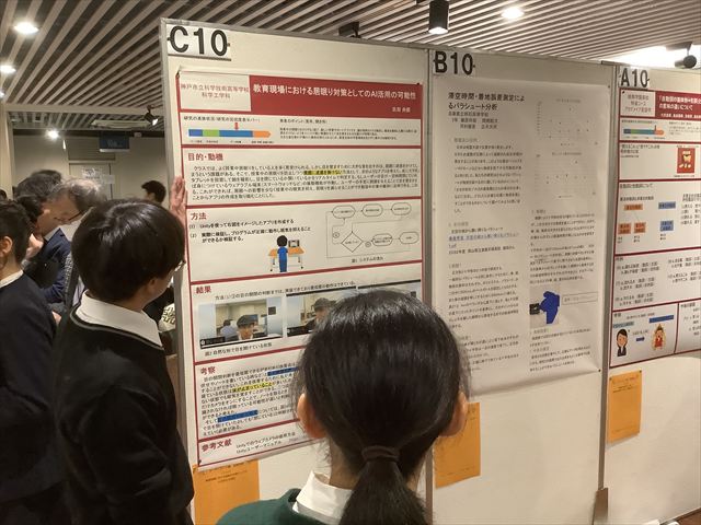 各発表に対しては甲南大学教員、大学院生、学部生。他校の高校教員、生徒から審査・コメントを頂戴しました。また私達からも同様に審査・コメントの機会が与えられ、積極的な質問と審査を行いました。幅広いテーマのポスター発表、まとめ方、発表スキルと大変多くの刺激を受けました。近いうち学長賞以外の審査の発表が行われます。結果を楽しみにして待ちたいと思います。