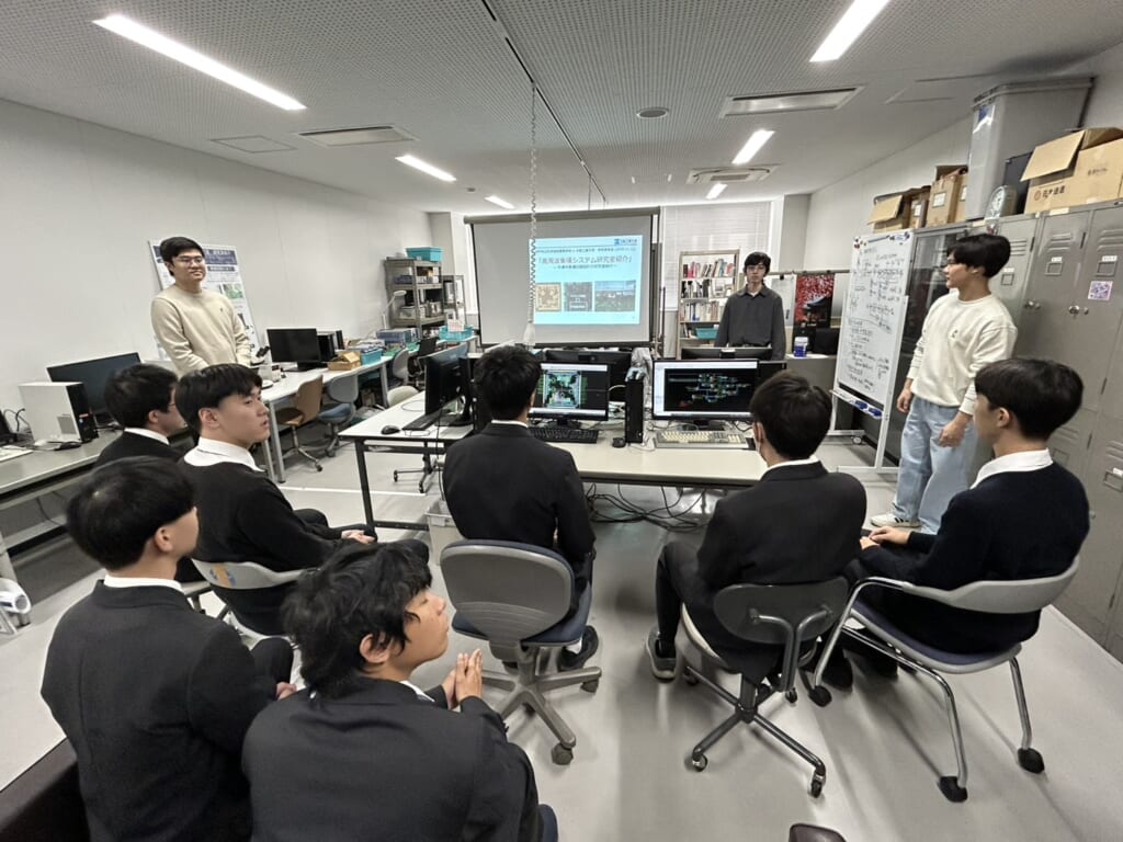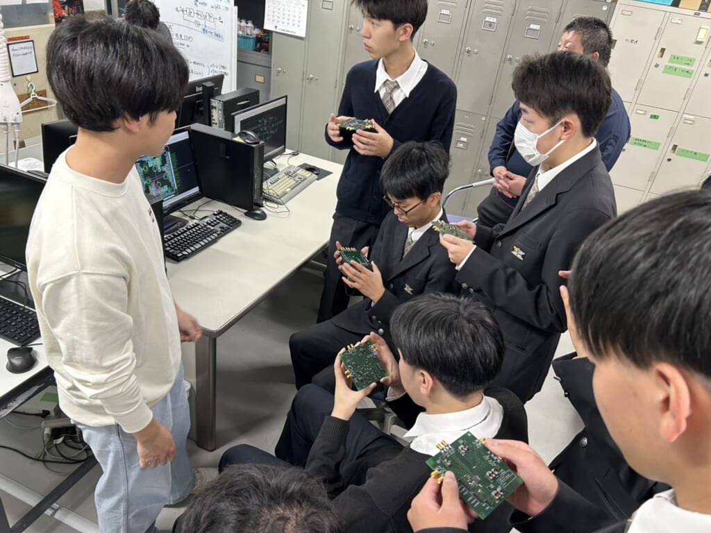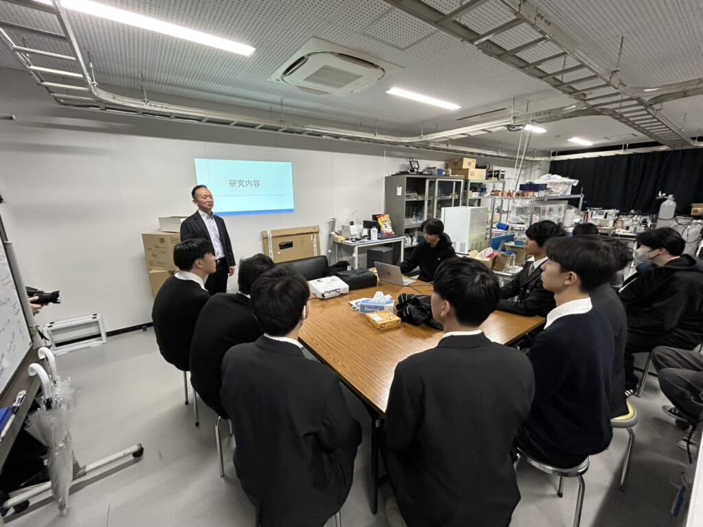 先月の12日、大阪工業大学との高大連携事業の一環で電気情報工学科課題研究「ワイヤレス給電装置の設計製作」班(元井太一先生担当)がワイヤレス給電の製作における知識を学ぶため、大宮キャンパスおよび、電気電子システム工学科の研究室を見学させていただきました。この課題研究班には産業実務化講師として工学部客員准教授の酒見議一先生にお越しいただいて指導していただいており、高大連携を最大限活かした研究になっています。