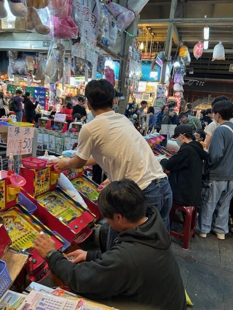 修学旅行、最後の夜は士林夜市に行きました。100元でチャレンジするゲームであちらこちらから歓声が上がっていました。景品のぬいぐるみを手にし、大満足の表情でした。