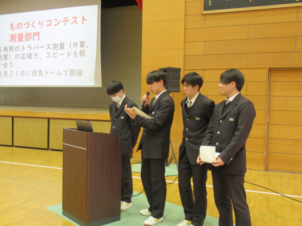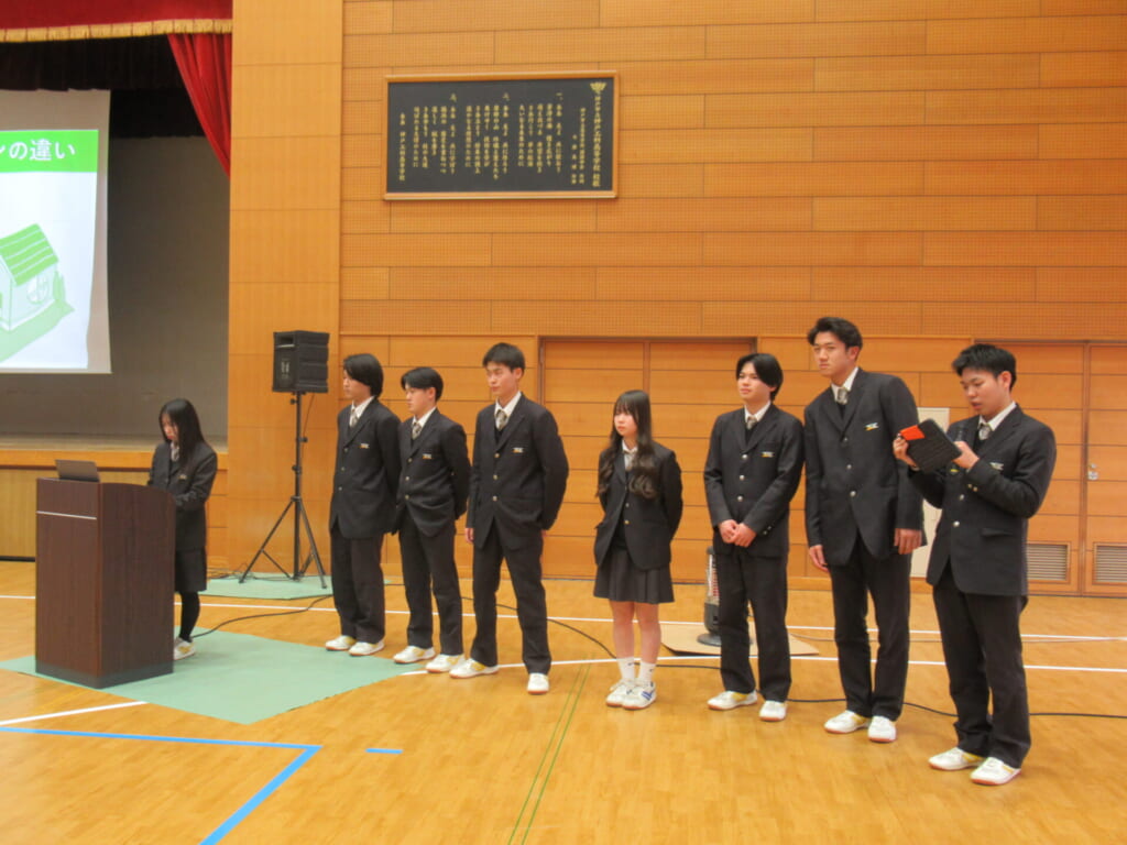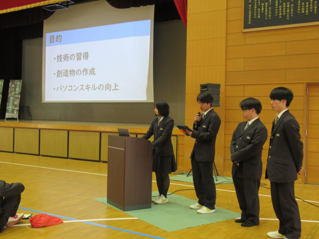 今回の発表会は、3年生が1年間取り組んだ成果を、1・2年生に向けて発表する場として開催されました。発表では、学んだことや苦労した点をPowerPointを活用して、分かりやすく伝えることができていました。また、成果物の展示も行われ、下級生のみなさんも興味深そうに見学していました。