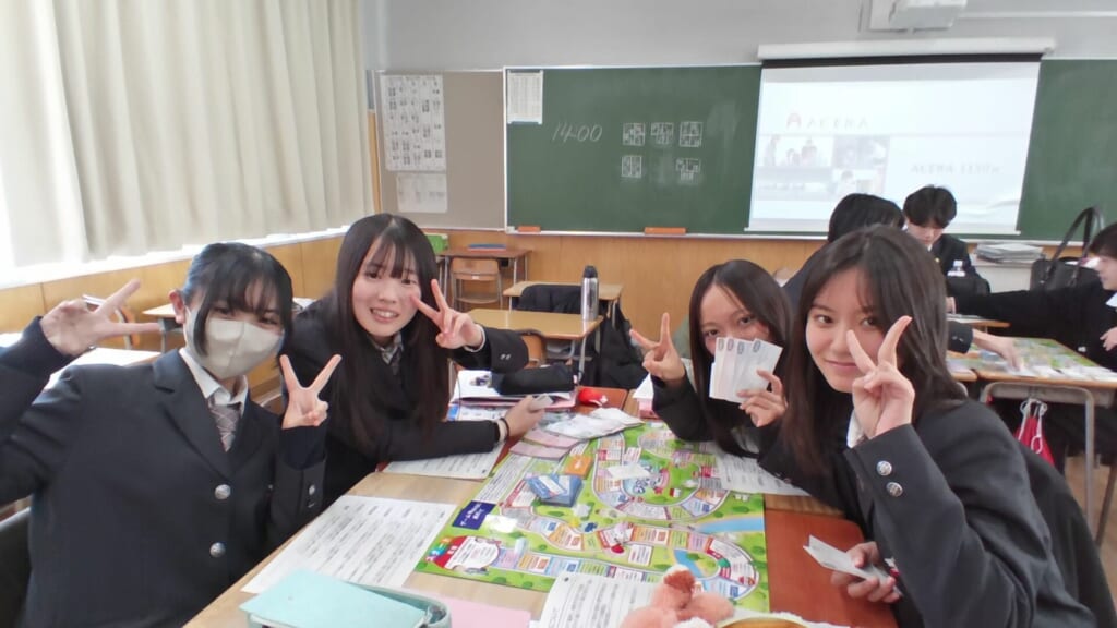 20代でiDeCoに加入するか、結婚はどうするか、子どもはいるのか、様々な選択をしていきます。40代になると住宅購入、子どもの進学、60代になると加入していたiDeCoはどうなっているのかなど65歳までの人生をすごろく形式で進んでいきます。様々な人生の選択を真剣に、かつ、楽しく話をしながら考えている様子は、一年間、家庭基礎で学んできた知識をいかし、話をしていることを随所に感じました。家庭基礎は一年生のみの学びとなりますが、衣食住、福祉、経済など様々な分野で学んだことを人生の中で活用してほしいと願っています。