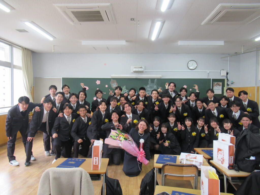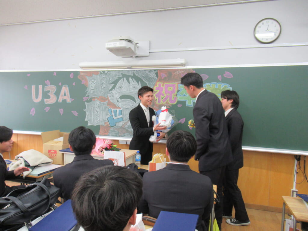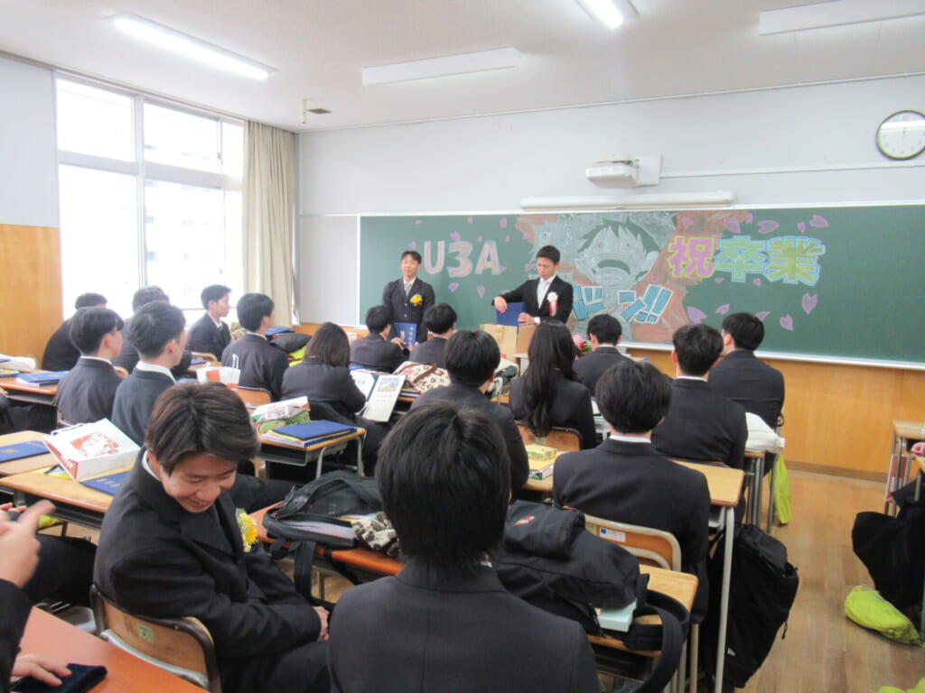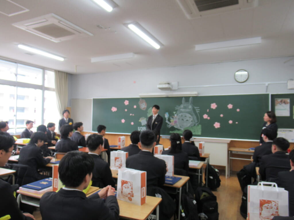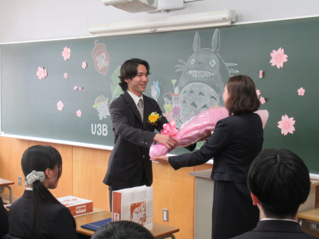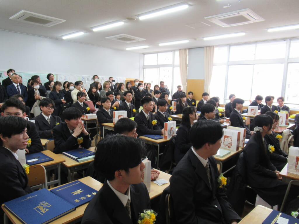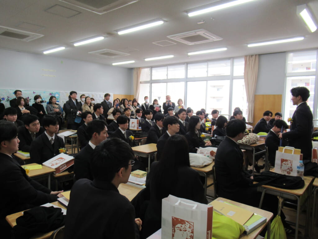 式後は、各クラスで最後のホームルームが行われました。一人ひとりが挨拶を述べ、保護者の皆様への感謝、日々支えてくれた担任の先生への思い、共に過ごした仲間への言葉があふれ、温かな雰囲気に包まれました。