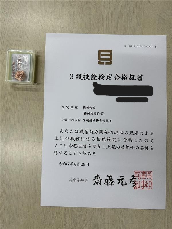 機械検査3級 合格者1名